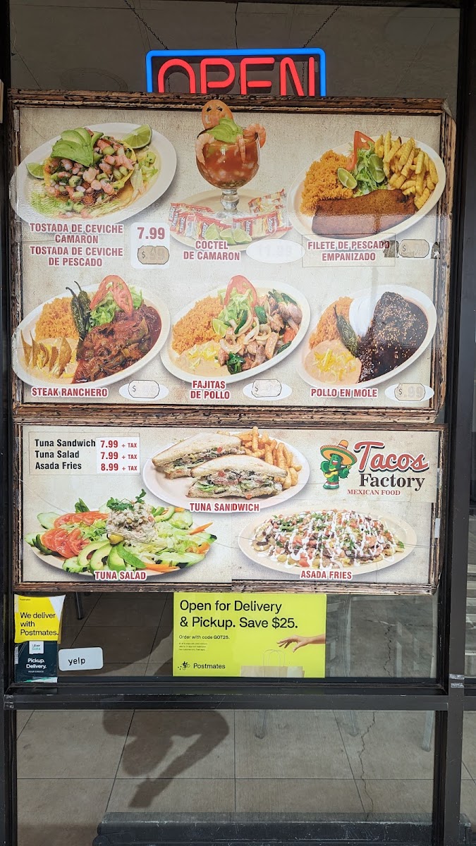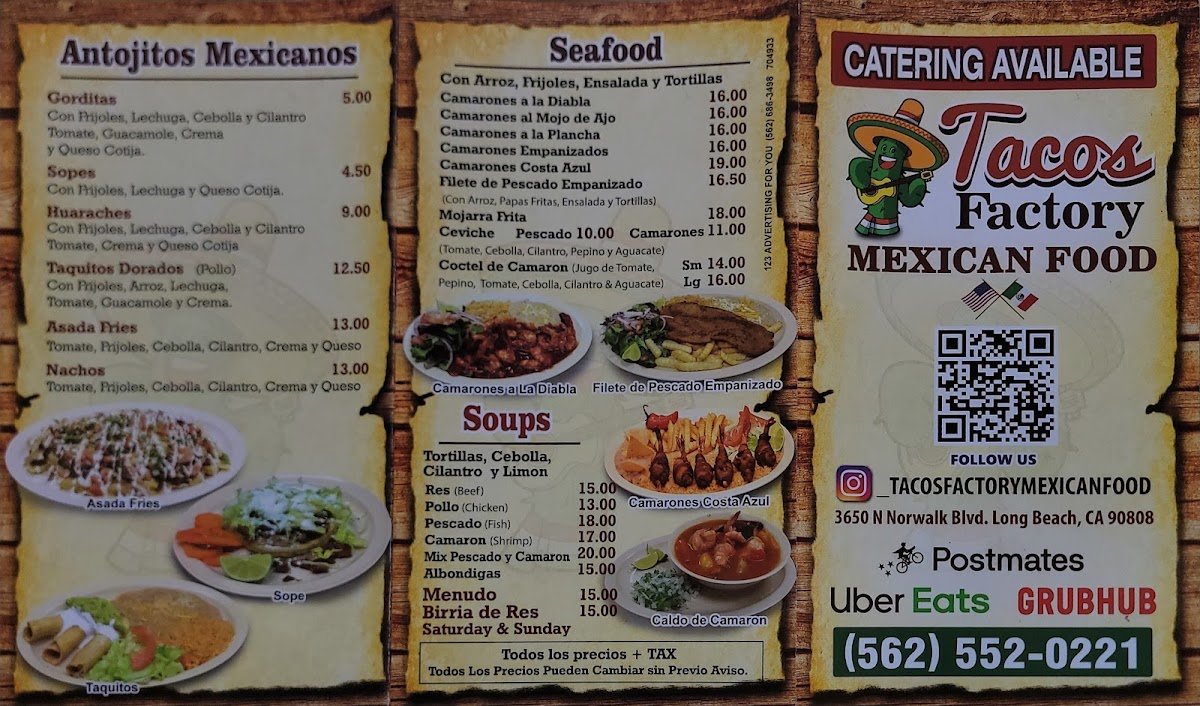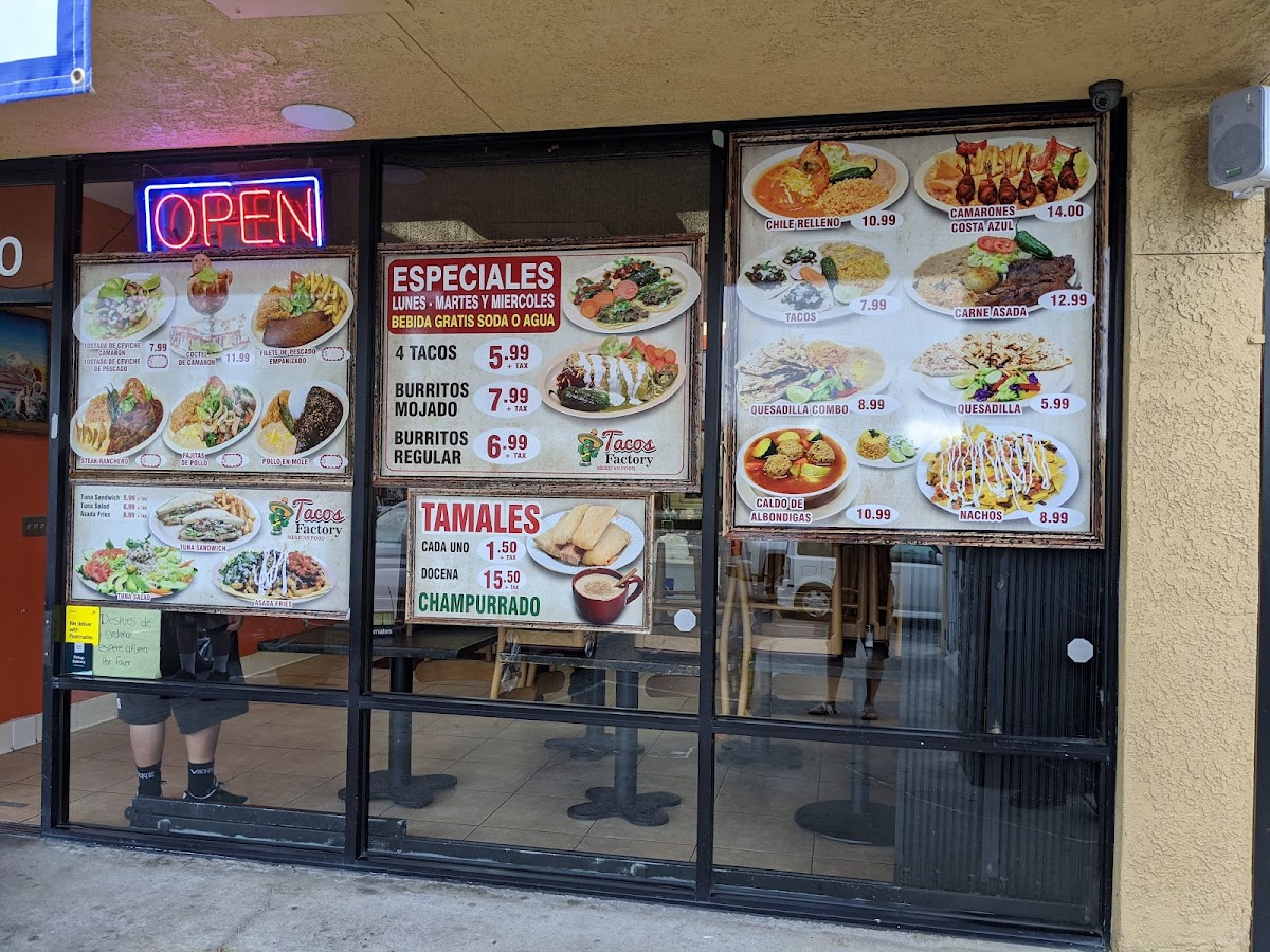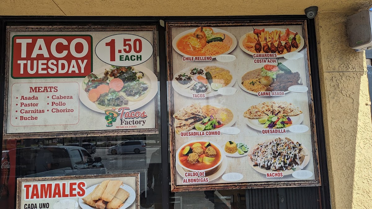 As a final takeaway on the menu at Taco Factory, the offering feels like a well-rounded celebration of classic Mexican comfort food, designed to satisfy a wide range of cravings. From the simplicity and everyday appeal of Tacos to the hearty street-style Torta, the menu immediately establishes its strong roots in traditional flavors. The burrito selection stands out with options like the classic Burrito, the indulgent Wet Burrito, and the crowd-pleasing California Burrito, each catering to different appetites and preferences. Breakfast lovers are equally well taken care of, with filling choices such as the BreakFast Burrito, the flavorful Chilaquiles Breakfast Plate, and homestyle egg dishes including Huevos Con Chorizo, Huevos Con Jamon, and Huevos Con Machaca. For those seeking something from the sea, dishes like Mojarra Frita, Camarones Costa Azul, Camarones A La Diabla, Camarones Al Mojo De Ajo, and Camarones A La Plancha add depth and variety to the menu. The comforting Home Made Soups-from Chicken Soup / Caldo De Pollo and Beef Soup / Caldo De Res to Fish Soup / Caldo De Pescado, Shrimp Soup / Caldo De Camaron, and Menudo-highlight a dedication to traditional, slow-cooked flavors. Meanwhile, popular Mexican snacks such as Sope, Gordita, Huarache, Nachos, and Asada Fries bring a casual, shareable element to the dining experience. Rounding everything out are the Special Mexican Dishes like Carne Asada, Pierna Enchilada, Chicken Fajitas, and Chile Relleno, which reinforce the menu’s authenticity and balance. Overall, Taco Factory’s menu feels thoughtfully curated, blending comfort, tradition, and variety into a satisfying and memorable dining experience.
