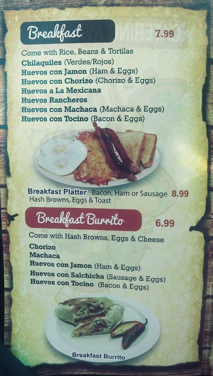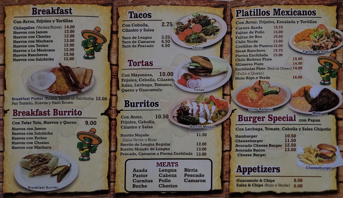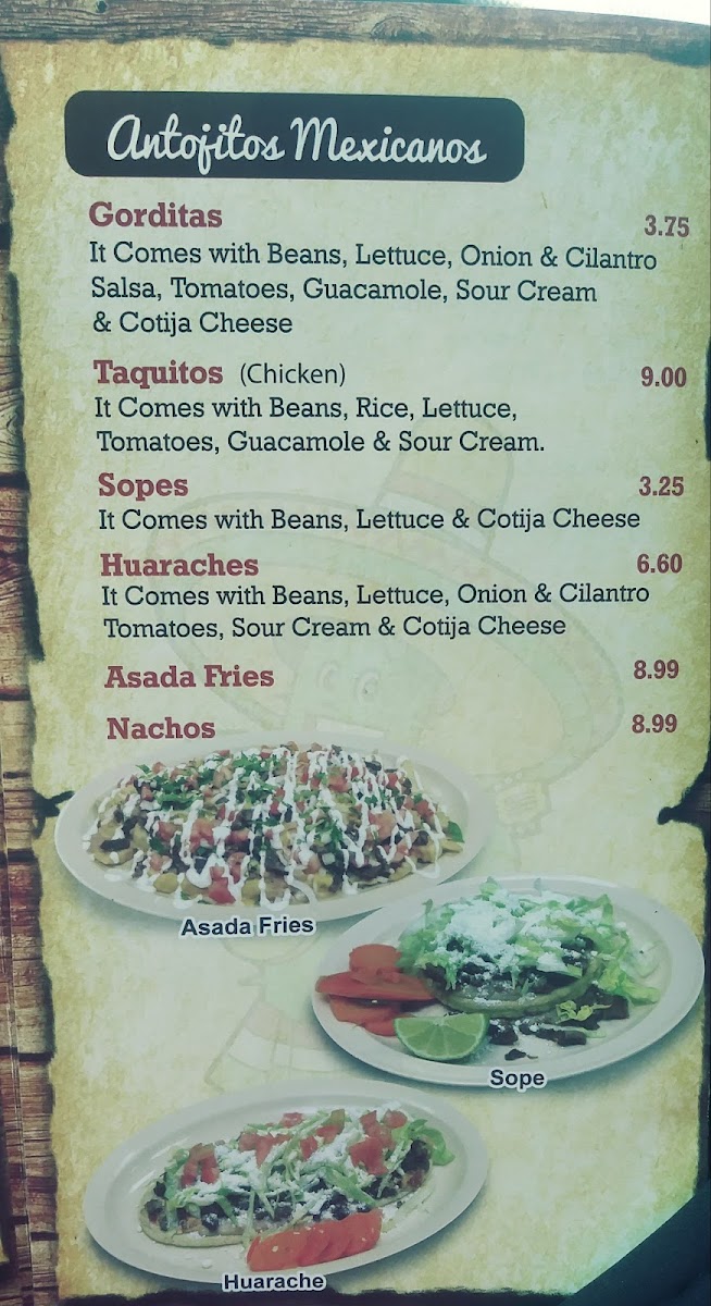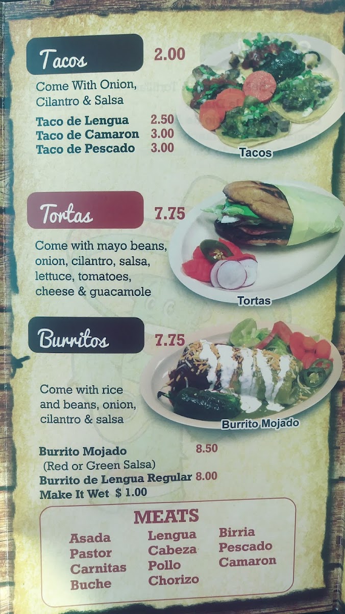 As a final takeaway on the menu at Taco Factory, the offering feels like a well-rounded celebration of classic Mexican comfort food, designed to satisfy a wide range of cravings. From the simplicity and everyday appeal of Tacos to the hearty street-style Torta, the menu immediately establishes its strong roots in traditional flavors. The burrito selection stands out with options like the classic Burrito, the indulgent Wet Burrito, and the crowd-pleasing California Burrito, each catering to different appetites and preferences. Breakfast lovers are equally well taken care of, with filling choices such as the BreakFast Burrito, the flavorful Chilaquiles Breakfast Plate, and homestyle egg dishes including Huevos Con Chorizo, Huevos Con Jamon, and Huevos Con Machaca. For those seeking something from the sea, dishes like Mojarra Frita, Camarones Costa Azul, Camarones A La Diabla, Camarones Al Mojo De Ajo, and Camarones A La Plancha add depth and variety to the menu. The comforting Home Made Soups-from Chicken Soup / Caldo De Pollo and Beef Soup / Caldo De Res to Fish Soup / Caldo De Pescado, Shrimp Soup / Caldo De Camaron, and Menudo-highlight a dedication to traditional, slow-cooked flavors. Meanwhile, popular Mexican snacks such as Sope, Gordita, Huarache, Nachos, and Asada Fries bring a casual, shareable element to the dining experience. Rounding everything out are the Special Mexican Dishes like Carne Asada, Pierna Enchilada, Chicken Fajitas, and Chile Relleno, which reinforce the menu’s authenticity and balance. Overall, Taco Factory’s menu feels thoughtfully curated, blending comfort, tradition, and variety into a satisfying and memorable dining experience.
